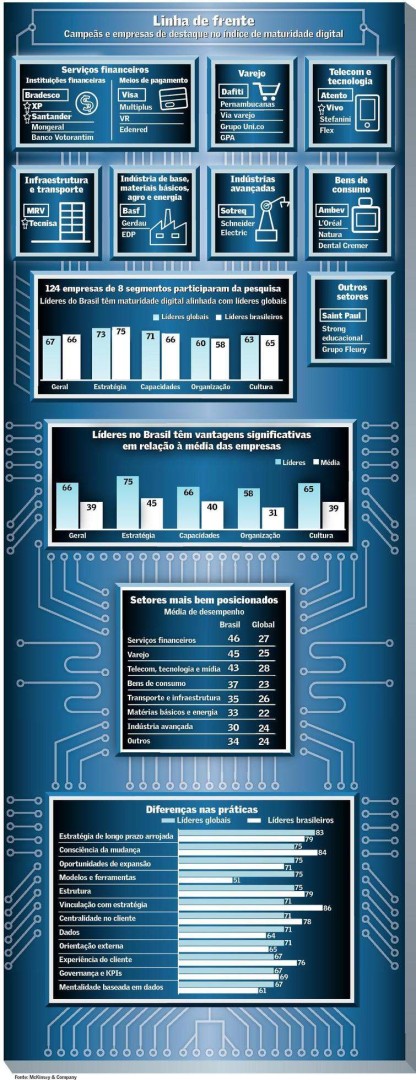 O Nível de maturidade foi medido por meio de uma ferramenta da própria McKinsey & Company, que avalia os processos em 9 etapas: Centralidade do Cliente, Estratégia Digital, Cultura e Talentos, Organização, Tecnologia, Experiência do Cliente, Uso de analytics, Operações e Resultados. Com isso foi possível avaliar o impacto das práticas de gestão digital.